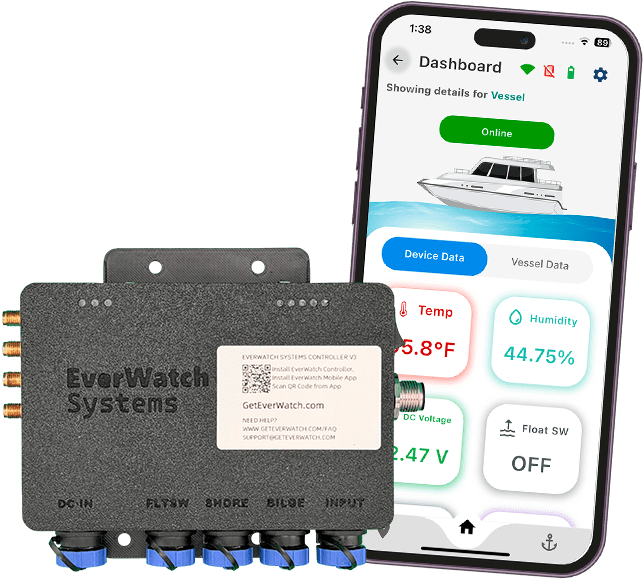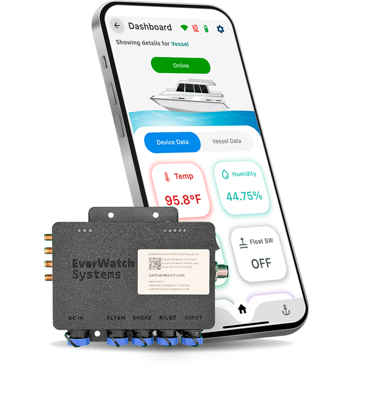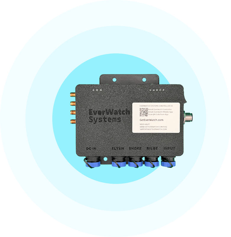 Built for the marine environment, the EverWatch Controller is rugged, weather-resistant, and engineered for life on the water. It connects all installed sensors, aggregates data, and transmits status updates via LTE or WiFi so you always know what’s happening aboard.